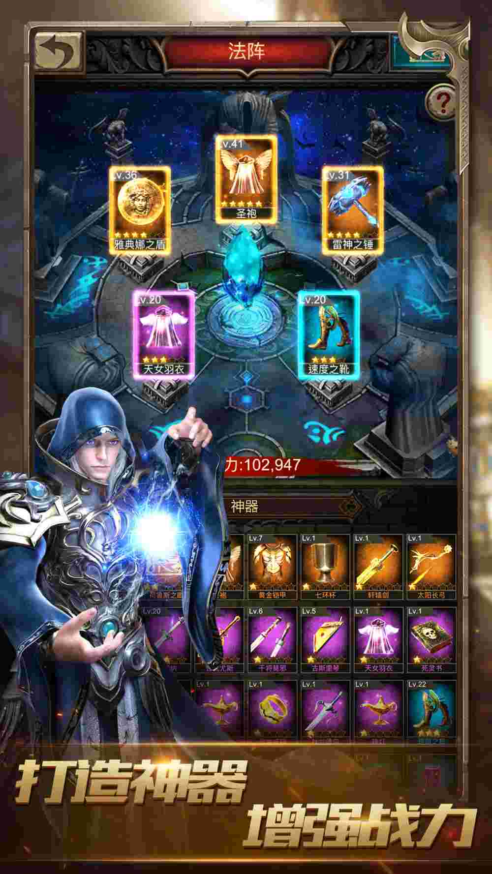 3、增加快速换装入口,城堡等级达到25级开启。(在同一界面快速进入神器、装备、神兽、成就以及角色科技界面,更换需要的属性加成。)